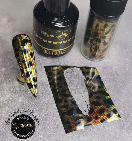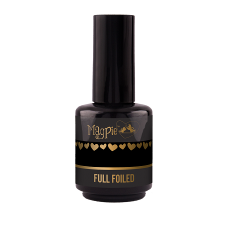 FULL FOILED is an extra sticky gel that allows for a full foil transfer onto the nail plate. Full Foiled is a 60 sec UV/LED cure.