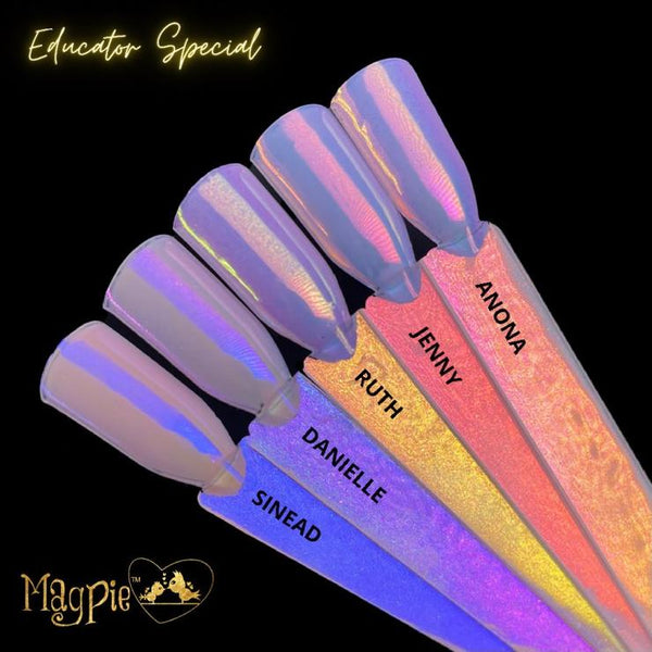 Jenny is a premium chrome that has a red effect. It can be applied in the traditional chrome method or patted onto the tacky inhibition layer of gel for a shimmer effect. For the chrome method, apply the chrome with the Magpie Chrome tool and if needed, rub in any excess with the Magpie Silicone Tool.