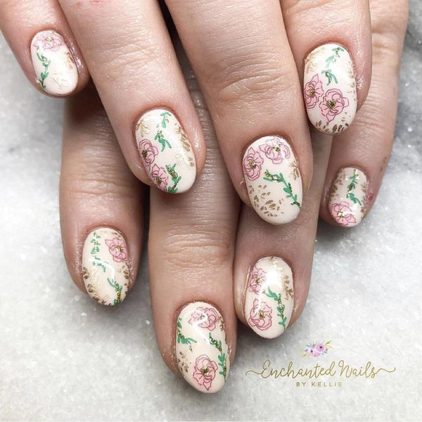 Add beautiful, delicate "sketched" look flowers and foliage to your next nail art design! Clusters of foliage and flowers from all angles, and a full coverage stamping design complete with numbers to help with layering!